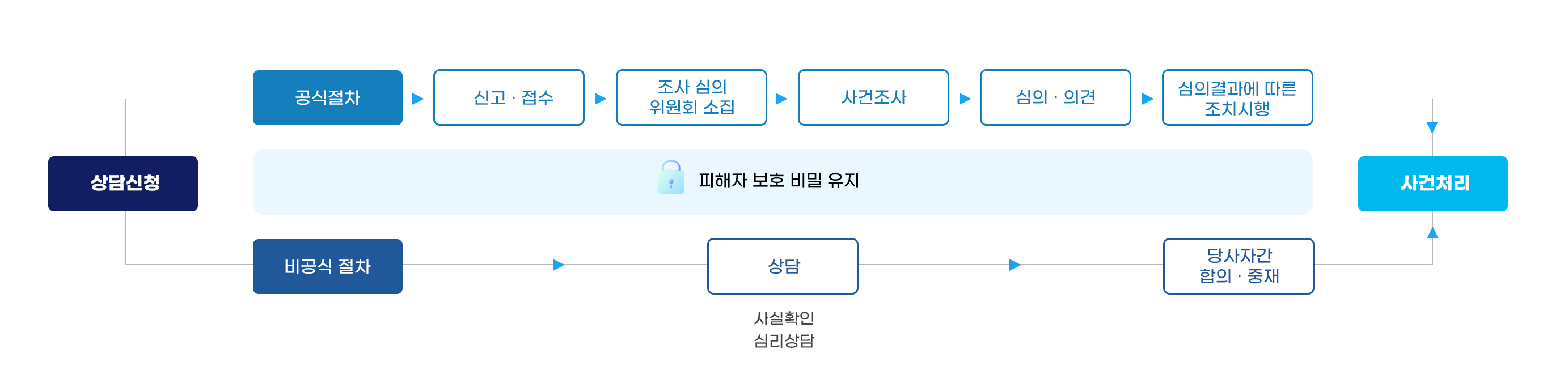 사건 해결의 공정성을 보장하기 위하여 조사심의위원회에 회부할 수 있으며 피해자 보호 및 지원, 가해자 교육 등의 추후관리가 이루어집니다.